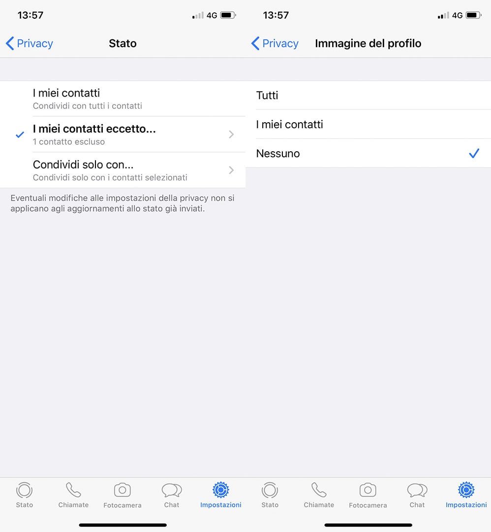 Un altro trucco molto interessante è impedire di vedere gli aggiornamenti di stato e di immagine del profilo ai nostri contatti. Per poterlo fare basterà ancora una volta recarsi in “Privacy” e poi selezionare le due voci relative a “Immagine del profilo “ e “Stato”.