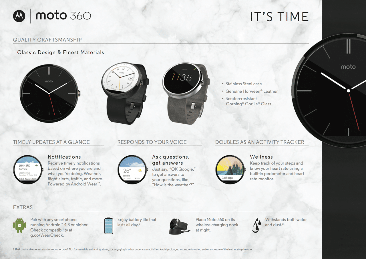 Motorola su queste infografiche spinge davvero molto su quelle che sono le funzionalità di Google e quelle di Motorola, di conseguenza i vari sensori che ha introdotto l’azienda alata, inoltre Motorola preme molto sul fatto che Motorola Moto 360 ha dei materiali molto premium.